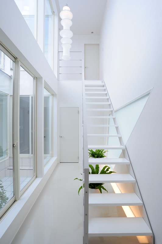 床や天井だけでなく、造作家具やキッチン、建具、階段なども全て白でまとめました。