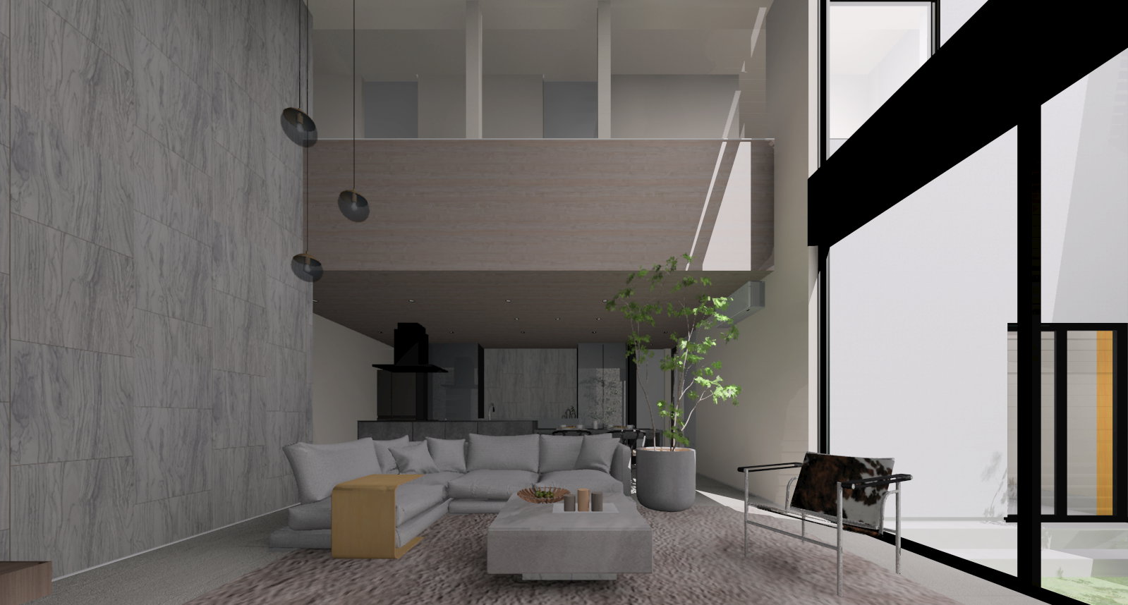▷大開口吹き抜けを間接照明用い2階までをつなげる印象的な空間
